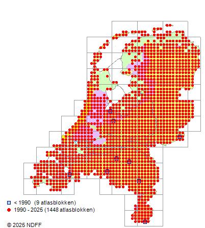 Het aantal atlasblokken (5x5 km) waarin de soort is gemeld binnen een periode van vijf jaar (vanaf 1980) of twintig jaar. Niet gecorrigeerd voor waarnemersinspanning en het aantal doorgegeven waarnemingen kan sterk variëren per periode, dus een trend in verspreiding kan hier niet direct uit worden afgelezen. Het opgegeven jaartal is het eerste jaar van de periode. Bron: gevalideerde waarnemingen uit de NDFF.