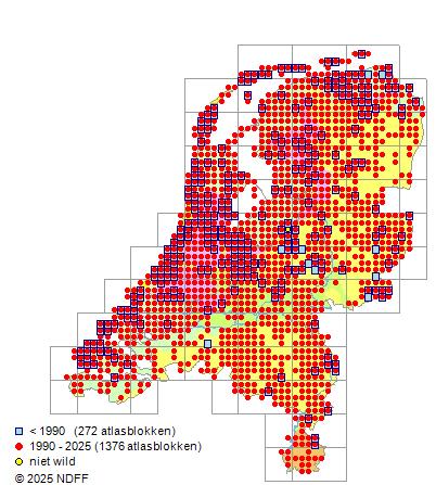 Het aantal atlasblokken (5x5 km) waarin de soort is gemeld binnen een periode van vijf jaar (vanaf 1980) of twintig jaar. Niet gecorrigeerd voor waarnemersinspanning en het aantal doorgegeven waarnemingen kan sterk variëren per periode, dus een trend in verspreiding kan hier niet direct uit worden afgelezen. Het opgegeven jaartal is het eerste jaar van de periode. Bron: gevalideerde waarnemingen uit de NDFF.