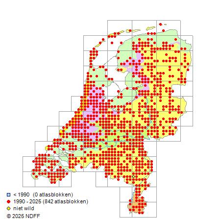Het aantal atlasblokken (5x5 km) waarin de soort is gemeld binnen een periode van vijf jaar (vanaf 1980) of twintig jaar. Niet gecorrigeerd voor waarnemersinspanning en het aantal doorgegeven waarnemingen kan sterk variëren per periode, dus een trend in verspreiding kan hier niet direct uit worden afgelezen. Het opgegeven jaartal is het eerste jaar van de periode. Bron: gevalideerde waarnemingen uit de NDFF.