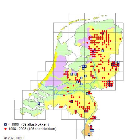 Het aantal atlasblokken (5x5 km) waarin de soort is gemeld binnen een periode van vijf jaar (vanaf 1980) of twintig jaar. Niet gecorrigeerd voor waarnemersinspanning en het aantal doorgegeven waarnemingen kan sterk variëren per periode, dus een trend in verspreiding kan hier niet direct uit worden afgelezen. Het opgegeven jaartal is het eerste jaar van de periode. Bron: gevalideerde waarnemingen uit de NDFF.