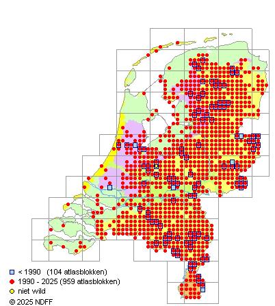 Het aantal atlasblokken (5x5 km) waarin de soort is gemeld binnen een periode van vijf jaar (vanaf 1980) of twintig jaar. Niet gecorrigeerd voor waarnemersinspanning en het aantal doorgegeven waarnemingen kan sterk variëren per periode, dus een trend in verspreiding kan hier niet direct uit worden afgelezen. Het opgegeven jaartal is het eerste jaar van de periode. Bron: gevalideerde waarnemingen uit de NDFF.