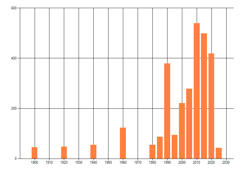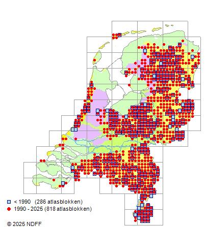 Het aantal atlasblokken (5x5 km) waarin de soort is gemeld binnen een periode van vijf jaar (vanaf 1980) of twintig jaar. Niet gecorrigeerd voor waarnemersinspanning en het aantal doorgegeven waarnemingen kan sterk variëren per periode, dus een trend in verspreiding kan hier niet direct uit worden afgelezen. Het opgegeven jaartal is het eerste jaar van de periode. Bron: gevalideerde waarnemingen uit de NDFF.