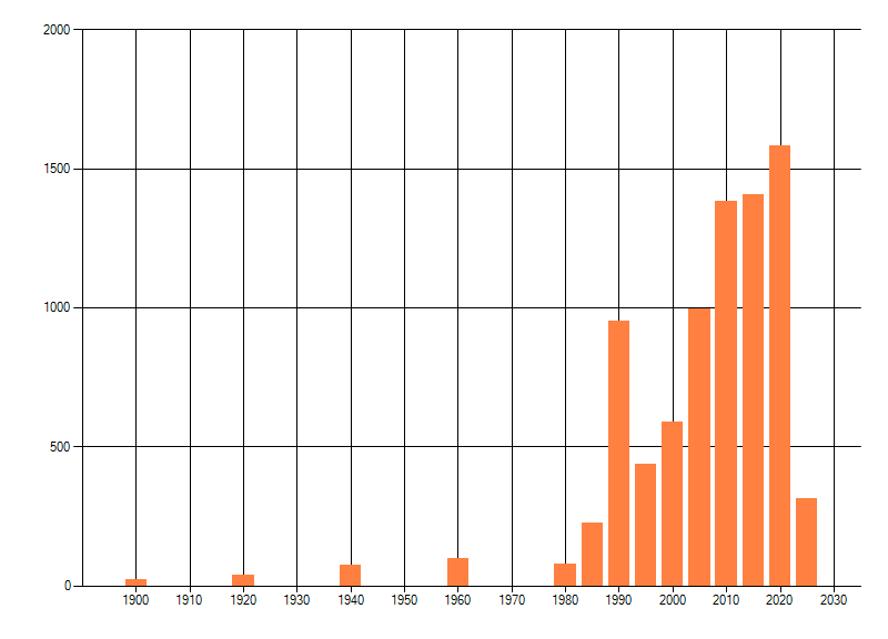 Het aantal atlasblokken (5x5 km) waarin de soort is gemeld binnen een periode van vijf jaar (vanaf 1980) of twintig jaar. Niet gecorrigeerd voor waarnemersinspanning en het aantal doorgegeven waarnemingen kan sterk variëren per periode, dus een trend in verspreiding kan hier niet direct uit worden afgelezen. Het opgegeven jaartal is het eerste jaar van de periode. Bron: gevalideerde waarnemingen uit de NDFF.