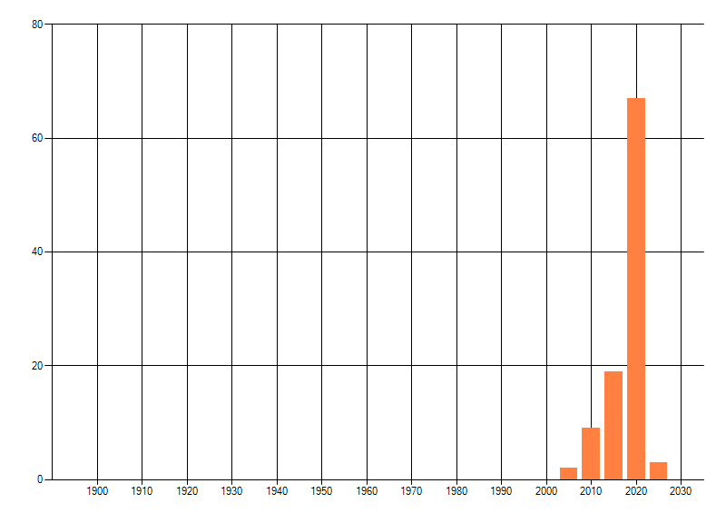 Het aantal atlasblokken (5x5 km) waarin de soort is gemeld binnen een periode van vijf jaar (vanaf 1980) of twintig jaar. Niet gecorrigeerd voor waarnemersinspanning en het aantal doorgegeven waarnemingen kan sterk variëren per periode, dus een trend in verspreiding kan hier niet direct uit worden afgelezen. Het opgegeven jaartal is het eerste jaar van de periode. Bron: gevalideerde waarnemingen uit de NDFF.