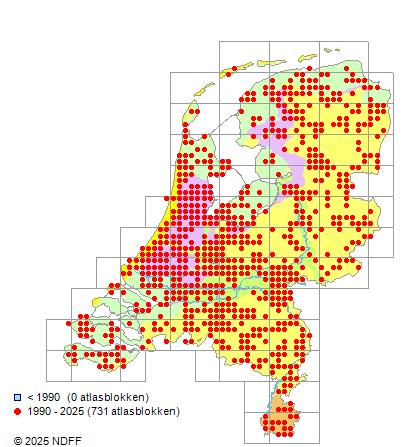 Het aantal atlasblokken (5x5 km) waarin de soort is gemeld binnen een periode van vijf jaar (vanaf 1980) of twintig jaar. Niet gecorrigeerd voor waarnemersinspanning en het aantal doorgegeven waarnemingen kan sterk variëren per periode, dus een trend in verspreiding kan hier niet direct uit worden afgelezen. Het opgegeven jaartal is het eerste jaar van de periode. Bron: gevalideerde waarnemingen uit de NDFF.