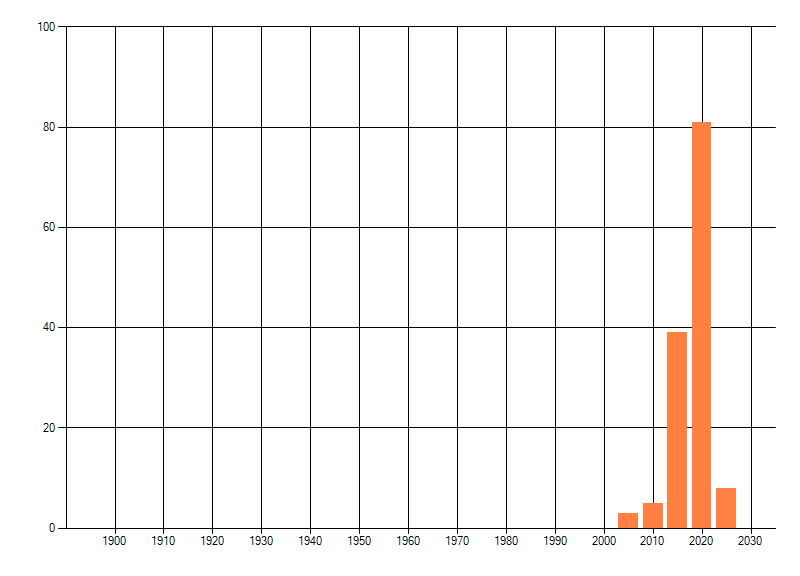 Het aantal atlasblokken (5x5 km) waarin de soort is gemeld binnen een periode van vijf jaar (vanaf 1980) of twintig jaar. Niet gecorrigeerd voor waarnemersinspanning en het aantal doorgegeven waarnemingen kan sterk variëren per periode, dus een trend in verspreiding kan hier niet direct uit worden afgelezen. Het opgegeven jaartal is het eerste jaar van de periode. Bron: gevalideerde waarnemingen uit de NDFF.