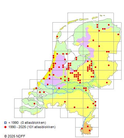 Het aantal atlasblokken (5x5 km) waarin de soort is gemeld binnen een periode van vijf jaar (vanaf 1980) of twintig jaar. Niet gecorrigeerd voor waarnemersinspanning en het aantal doorgegeven waarnemingen kan sterk variëren per periode, dus een trend in verspreiding kan hier niet direct uit worden afgelezen. Het opgegeven jaartal is het eerste jaar van de periode. Bron: gevalideerde waarnemingen uit de NDFF.