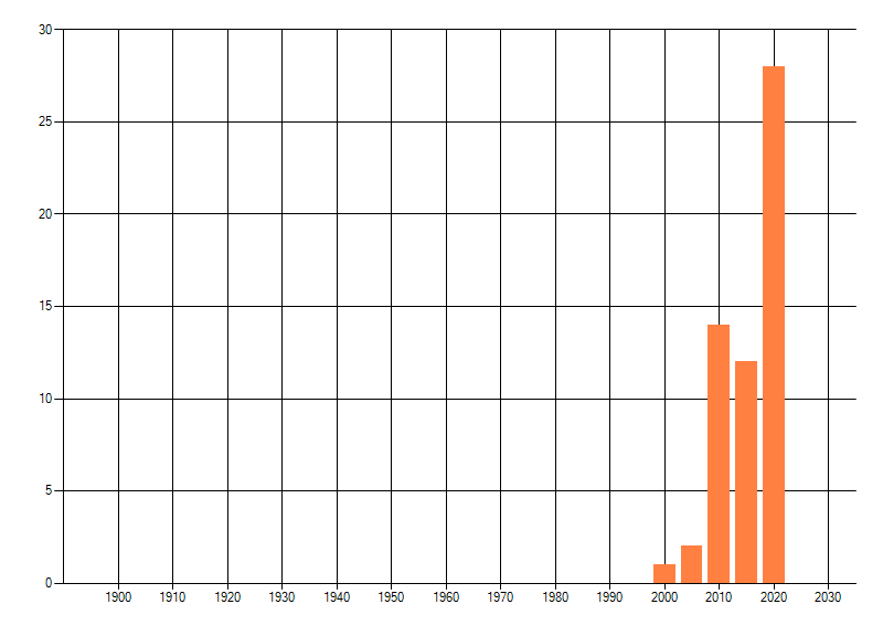 Het aantal atlasblokken (5x5 km) waarin de soort is gemeld binnen een periode van vijf jaar (vanaf 1980) of twintig jaar. Niet gecorrigeerd voor waarnemersinspanning en het aantal doorgegeven waarnemingen kan sterk variëren per periode, dus een trend in verspreiding kan hier niet direct uit worden afgelezen. Het opgegeven jaartal is het eerste jaar van de periode. Bron: gevalideerde waarnemingen uit de NDFF.