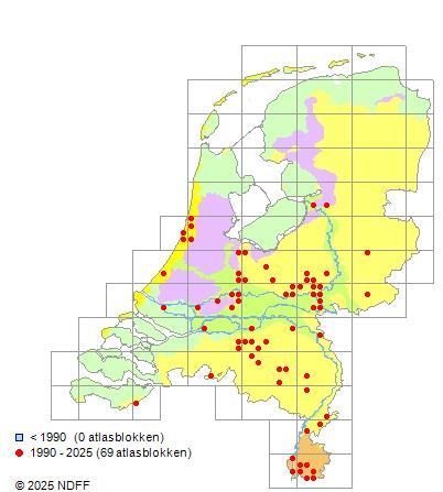 Het aantal atlasblokken (5x5 km) waarin de soort is gemeld binnen een periode van vijf jaar (vanaf 1980) of twintig jaar. Niet gecorrigeerd voor waarnemersinspanning en het aantal doorgegeven waarnemingen kan sterk variëren per periode, dus een trend in verspreiding kan hier niet direct uit worden afgelezen. Het opgegeven jaartal is het eerste jaar van de periode. Bron: gevalideerde waarnemingen uit de NDFF.