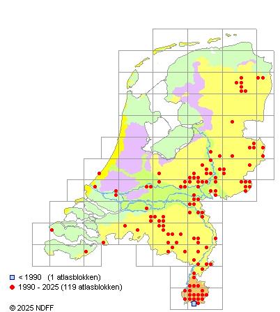 Het aantal atlasblokken (5x5 km) waarin de soort is gemeld binnen een periode van vijf jaar (vanaf 1980) of twintig jaar. Niet gecorrigeerd voor waarnemersinspanning en het aantal doorgegeven waarnemingen kan sterk variëren per periode, dus een trend in verspreiding kan hier niet direct uit worden afgelezen. Het opgegeven jaartal is het eerste jaar van de periode. Bron: gevalideerde waarnemingen uit de NDFF.