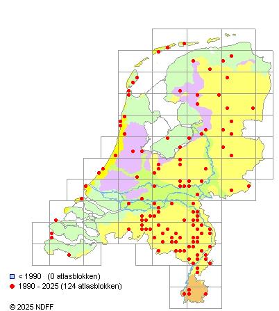 Het aantal atlasblokken (5x5 km) waarin de soort is gemeld binnen een periode van vijf jaar (vanaf 1980) of twintig jaar. Niet gecorrigeerd voor waarnemersinspanning en het aantal doorgegeven waarnemingen kan sterk variëren per periode, dus een trend in verspreiding kan hier niet direct uit worden afgelezen. Het opgegeven jaartal is het eerste jaar van de periode. Bron: gevalideerde waarnemingen uit de NDFF.