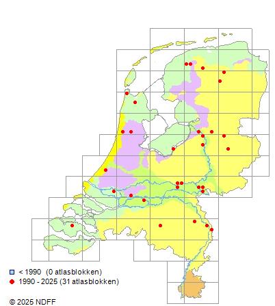 Het aantal atlasblokken (5x5 km) waarin de soort is gemeld binnen een periode van vijf jaar (vanaf 1980) of twintig jaar. Niet gecorrigeerd voor waarnemersinspanning en het aantal doorgegeven waarnemingen kan sterk variëren per periode, dus een trend in verspreiding kan hier niet direct uit worden afgelezen. Het opgegeven jaartal is het eerste jaar van de periode. Bron: gevalideerde waarnemingen uit de NDFF.