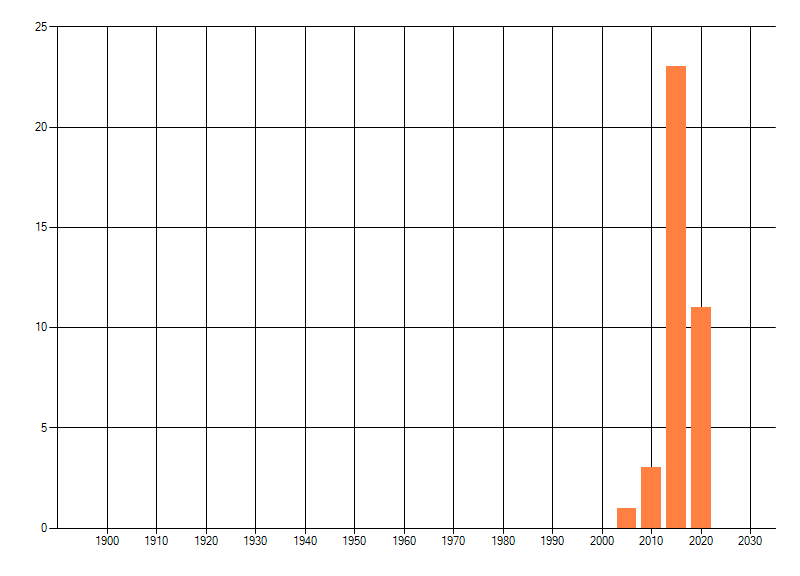 Het aantal atlasblokken (5x5 km) waarin de soort is gemeld binnen een periode van vijf jaar (vanaf 1980) of twintig jaar. Niet gecorrigeerd voor waarnemersinspanning en het aantal doorgegeven waarnemingen kan sterk variëren per periode, dus een trend in verspreiding kan hier niet direct uit worden afgelezen. Het opgegeven jaartal is het eerste jaar van de periode. Bron: gevalideerde waarnemingen uit de NDFF.