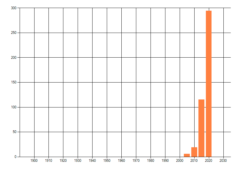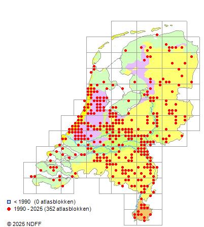 Het aantal atlasblokken (5x5 km) waarin de soort is gemeld binnen een periode van vijf jaar (vanaf 1980) of twintig jaar. Niet gecorrigeerd voor waarnemersinspanning en het aantal doorgegeven waarnemingen kan sterk variëren per periode, dus een trend in verspreiding kan hier niet direct uit worden afgelezen. Het opgegeven jaartal is het eerste jaar van de periode. Bron: gevalideerde waarnemingen uit de NDFF.