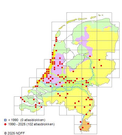Het aantal atlasblokken (5x5 km) waarin de soort is gemeld binnen een periode van vijf jaar (vanaf 1980) of twintig jaar. Niet gecorrigeerd voor waarnemersinspanning en het aantal doorgegeven waarnemingen kan sterk variëren per periode, dus een trend in verspreiding kan hier niet direct uit worden afgelezen. Het opgegeven jaartal is het eerste jaar van de periode. Bron: gevalideerde waarnemingen uit de NDFF.