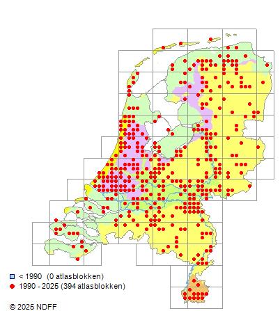 Het aantal atlasblokken (5x5 km) waarin de soort is gemeld binnen een periode van vijf jaar (vanaf 1980) of twintig jaar. Niet gecorrigeerd voor waarnemersinspanning en het aantal doorgegeven waarnemingen kan sterk variëren per periode, dus een trend in verspreiding kan hier niet direct uit worden afgelezen. Het opgegeven jaartal is het eerste jaar van de periode. Bron: gevalideerde waarnemingen uit de NDFF.
