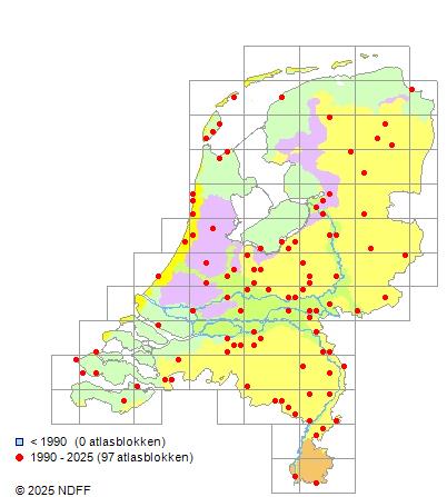 Het aantal atlasblokken (5x5 km) waarin de soort is gemeld binnen een periode van vijf jaar (vanaf 1980) of twintig jaar. Niet gecorrigeerd voor waarnemersinspanning en het aantal doorgegeven waarnemingen kan sterk variëren per periode, dus een trend in verspreiding kan hier niet direct uit worden afgelezen. Het opgegeven jaartal is het eerste jaar van de periode. Bron: gevalideerde waarnemingen uit de NDFF.
