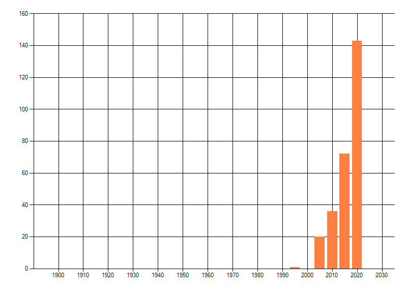 Het aantal atlasblokken (5x5 km) waarin de soort is gemeld binnen een periode van vijf jaar (vanaf 1980) of twintig jaar. Niet gecorrigeerd voor waarnemersinspanning en het aantal doorgegeven waarnemingen kan sterk variëren per periode, dus een trend in verspreiding kan hier niet direct uit worden afgelezen. Het opgegeven jaartal is het eerste jaar van de periode. Bron: gevalideerde waarnemingen uit de NDFF.
