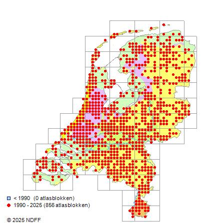 Het aantal atlasblokken (5x5 km) waarin de soort is gemeld binnen een periode van vijf jaar (vanaf 1980) of twintig jaar. Niet gecorrigeerd voor waarnemersinspanning en het aantal doorgegeven waarnemingen kan sterk variëren per periode, dus een trend in verspreiding kan hier niet direct uit worden afgelezen. Het opgegeven jaartal is het eerste jaar van de periode. Bron: gevalideerde waarnemingen uit de NDFF.