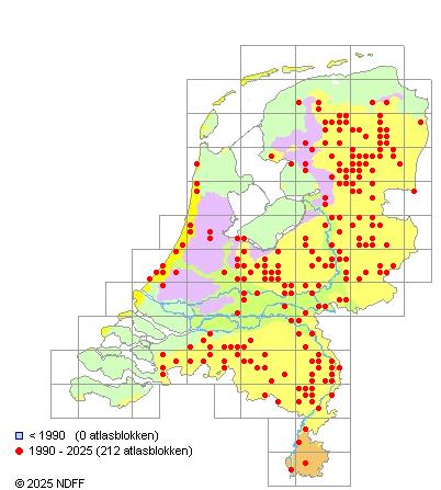 Het aantal atlasblokken (5x5 km) waarin de soort is gemeld binnen een periode van vijf jaar (vanaf 1980) of twintig jaar. Niet gecorrigeerd voor waarnemersinspanning en het aantal doorgegeven waarnemingen kan sterk variëren per periode, dus een trend in verspreiding kan hier niet direct uit worden afgelezen. Het opgegeven jaartal is het eerste jaar van de periode. Bron: gevalideerde waarnemingen uit de NDFF.