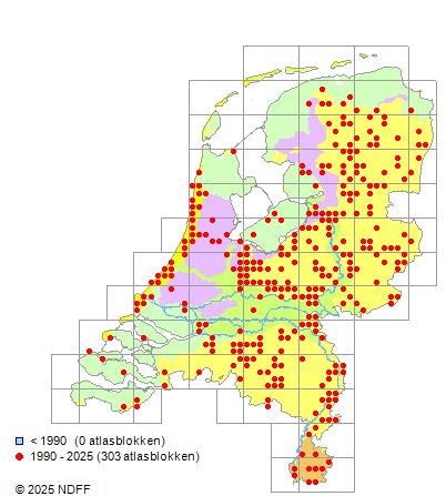 Het aantal atlasblokken (5x5 km) waarin de soort is gemeld binnen een periode van vijf jaar (vanaf 1980) of twintig jaar. Niet gecorrigeerd voor waarnemersinspanning en het aantal doorgegeven waarnemingen kan sterk variëren per periode, dus een trend in verspreiding kan hier niet direct uit worden afgelezen. Het opgegeven jaartal is het eerste jaar van de periode. Bron: gevalideerde waarnemingen uit de NDFF.