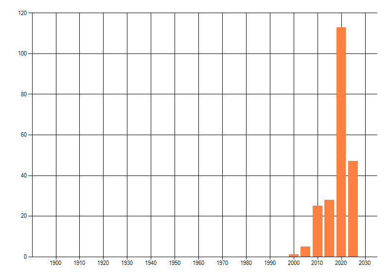 Het aantal atlasblokken (5x5 km) waarin de soort is gemeld binnen een periode van vijf jaar (vanaf 1980) of twintig jaar. Niet gecorrigeerd voor waarnemersinspanning en het aantal doorgegeven waarnemingen kan sterk variëren per periode, dus een trend in verspreiding kan hier niet direct uit worden afgelezen. Het opgegeven jaartal is het eerste jaar van de periode. Bron: gevalideerde waarnemingen uit de NDFF.