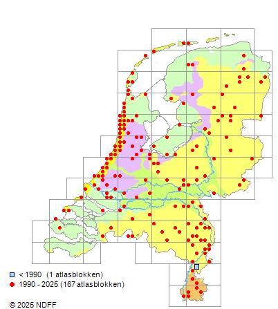 Het aantal atlasblokken (5x5 km) waarin de soort is gemeld binnen een periode van vijf jaar (vanaf 1980) of twintig jaar. Niet gecorrigeerd voor waarnemersinspanning en het aantal doorgegeven waarnemingen kan sterk variëren per periode, dus een trend in verspreiding kan hier niet direct uit worden afgelezen. Het opgegeven jaartal is het eerste jaar van de periode. Bron: gevalideerde waarnemingen uit de NDFF.