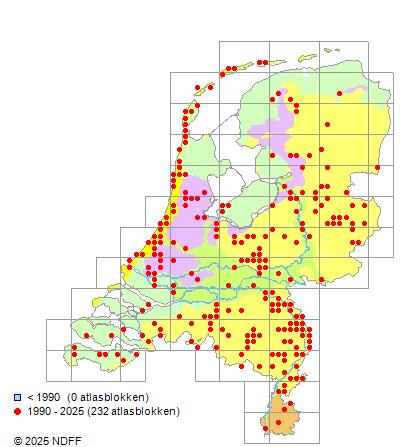 Het aantal atlasblokken (5x5 km) waarin de soort is gemeld binnen een periode van vijf jaar (vanaf 1980) of twintig jaar. Niet gecorrigeerd voor waarnemersinspanning en het aantal doorgegeven waarnemingen kan sterk variëren per periode, dus een trend in verspreiding kan hier niet direct uit worden afgelezen. Het opgegeven jaartal is het eerste jaar van de periode. Bron: gevalideerde waarnemingen uit de NDFF.
