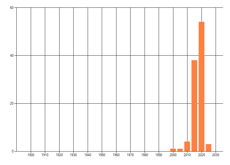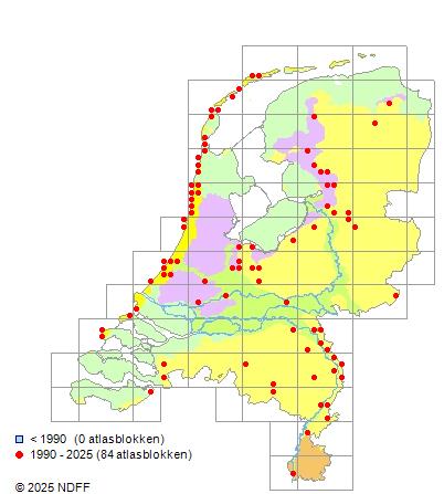 Het aantal atlasblokken (5x5 km) waarin de soort is gemeld binnen een periode van vijf jaar (vanaf 1980) of twintig jaar. Niet gecorrigeerd voor waarnemersinspanning en het aantal doorgegeven waarnemingen kan sterk variëren per periode, dus een trend in verspreiding kan hier niet direct uit worden afgelezen. Het opgegeven jaartal is het eerste jaar van de periode. Bron: gevalideerde waarnemingen uit de NDFF.