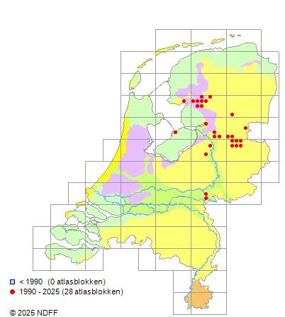 Het aantal atlasblokken (5x5 km) waarin de soort is gemeld binnen een periode van vijf jaar (vanaf 1980) of twintig jaar. Niet gecorrigeerd voor waarnemersinspanning en het aantal doorgegeven waarnemingen kan sterk variëren per periode, dus een trend in verspreiding kan hier niet direct uit worden afgelezen. Het opgegeven jaartal is het eerste jaar van de periode. Bron: gevalideerde waarnemingen uit de NDFF.