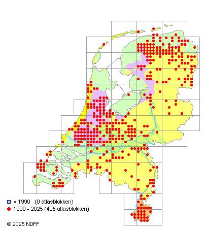 Het aantal atlasblokken (5x5 km) waarin de soort is gemeld binnen een periode van vijf jaar (vanaf 1980) of twintig jaar. Niet gecorrigeerd voor waarnemersinspanning en het aantal doorgegeven waarnemingen kan sterk variëren per periode, dus een trend in verspreiding kan hier niet direct uit worden afgelezen. Het opgegeven jaartal is het eerste jaar van de periode. Bron: gevalideerde waarnemingen uit de NDFF.