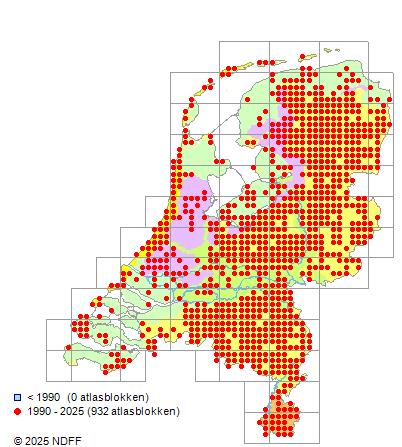 Het aantal atlasblokken (5x5 km) waarin de soort is gemeld binnen een periode van vijf jaar (vanaf 1980) of twintig jaar. Niet gecorrigeerd voor waarnemersinspanning en het aantal doorgegeven waarnemingen kan sterk variëren per periode, dus een trend in verspreiding kan hier niet direct uit worden afgelezen. Het opgegeven jaartal is het eerste jaar van de periode. Bron: gevalideerde waarnemingen uit de NDFF.