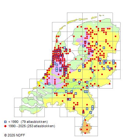 Het aantal atlasblokken (5x5 km) waarin de soort is gemeld binnen een periode van vijf jaar (vanaf 1980) of twintig jaar. Niet gecorrigeerd voor waarnemersinspanning en het aantal doorgegeven waarnemingen kan sterk variëren per periode, dus een trend in verspreiding kan hier niet direct uit worden afgelezen. Het opgegeven jaartal is het eerste jaar van de periode. Bron: gevalideerde waarnemingen uit de NDFF.