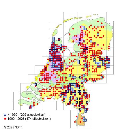 Het aantal atlasblokken (5x5 km) waarin de soort is gemeld binnen een periode van vijf jaar (vanaf 1980) of twintig jaar. Niet gecorrigeerd voor waarnemersinspanning en het aantal doorgegeven waarnemingen kan sterk variëren per periode, dus een trend in verspreiding kan hier niet direct uit worden afgelezen. Het opgegeven jaartal is het eerste jaar van de periode. Bron: gevalideerde waarnemingen uit de NDFF.