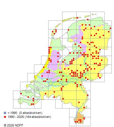Het aantal atlasblokken (5x5 km) waarin de soort is gemeld binnen een periode van vijf jaar (vanaf 1980) of twintig jaar. Niet gecorrigeerd voor waarnemersinspanning en het aantal doorgegeven waarnemingen kan sterk variëren per periode, dus een trend in verspreiding kan hier niet direct uit worden afgelezen. Het opgegeven jaartal is het eerste jaar van de periode. Bron: gevalideerde waarnemingen uit de NDFF.