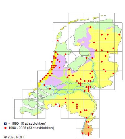 Het aantal atlasblokken (5x5 km) waarin de soort is gemeld binnen een periode van vijf jaar (vanaf 1980) of twintig jaar. Niet gecorrigeerd voor waarnemersinspanning en het aantal doorgegeven waarnemingen kan sterk variëren per periode, dus een trend in verspreiding kan hier niet direct uit worden afgelezen. Het opgegeven jaartal is het eerste jaar van de periode. Bron: gevalideerde waarnemingen uit de NDFF.