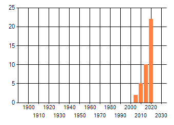 Het aantal atlasblokken (5x5 km) waarin de soort is gemeld binnen een periode van vijf jaar (vanaf 1980) of twintig jaar. Niet gecorrigeerd voor waarnemersinspanning en het aantal doorgegeven waarnemingen kan sterk variëren per periode, dus een trend in verspreiding kan hier niet direct uit worden afgelezen. Het opgegeven jaartal is het eerste jaar van de periode. Bron: gevalideerde waarnemingen uit de NDFF.
