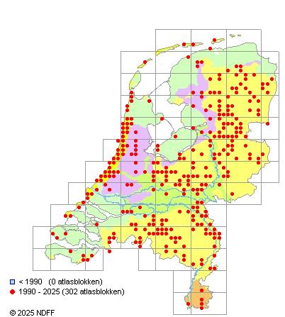 Het aantal atlasblokken (5x5 km) waarin de soort is gemeld binnen een periode van vijf jaar (vanaf 1980) of twintig jaar. Niet gecorrigeerd voor waarnemersinspanning en het aantal doorgegeven waarnemingen kan sterk variëren per periode, dus een trend in verspreiding kan hier niet direct uit worden afgelezen. Het opgegeven jaartal is het eerste jaar van de periode. Bron: gevalideerde waarnemingen uit de NDFF.
