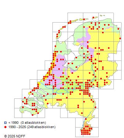 Het aantal atlasblokken (5x5 km) waarin de soort is gemeld binnen een periode van vijf jaar (vanaf 1980) of twintig jaar. Niet gecorrigeerd voor waarnemersinspanning en het aantal doorgegeven waarnemingen kan sterk variëren per periode, dus een trend in verspreiding kan hier niet direct uit worden afgelezen. Het opgegeven jaartal is het eerste jaar van de periode. Bron: gevalideerde waarnemingen uit de NDFF.