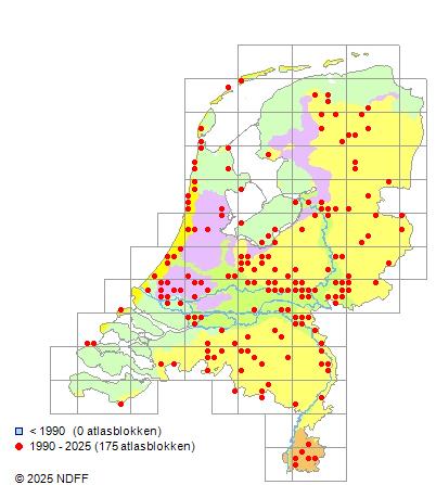 Het aantal atlasblokken (5x5 km) waarin de soort is gemeld binnen een periode van vijf jaar (vanaf 1980) of twintig jaar. Niet gecorrigeerd voor waarnemersinspanning en het aantal doorgegeven waarnemingen kan sterk variëren per periode, dus een trend in verspreiding kan hier niet direct uit worden afgelezen. Het opgegeven jaartal is het eerste jaar van de periode. Bron: gevalideerde waarnemingen uit de NDFF.
