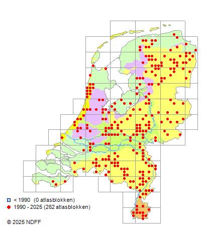 Het aantal atlasblokken (5x5 km) waarin de soort is gemeld binnen een periode van vijf jaar (vanaf 1980) of twintig jaar. Niet gecorrigeerd voor waarnemersinspanning en het aantal doorgegeven waarnemingen kan sterk variëren per periode, dus een trend in verspreiding kan hier niet direct uit worden afgelezen. Het opgegeven jaartal is het eerste jaar van de periode. Bron: gevalideerde waarnemingen uit de NDFF.
