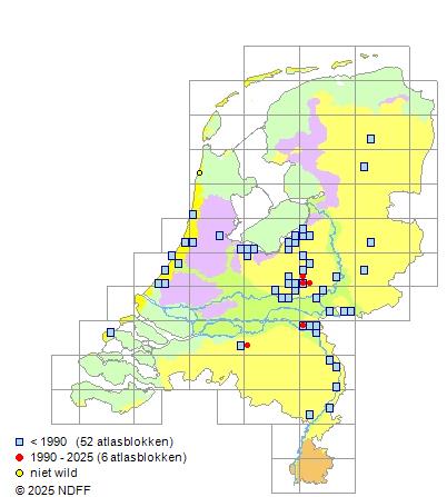 Het aantal atlasblokken (5x5 km) waarin de soort is gemeld binnen een periode van vijf jaar (vanaf 1980) of twintig jaar. Niet gecorrigeerd voor waarnemersinspanning en het aantal doorgegeven waarnemingen kan sterk variëren per periode, dus een trend in verspreiding kan hier niet direct uit worden afgelezen. Het opgegeven jaartal is het eerste jaar van de periode. Bron: gevalideerde waarnemingen uit de NDFF.