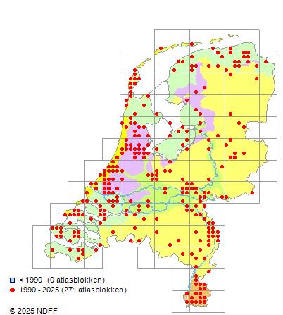 Het aantal atlasblokken (5x5 km) waarin de soort is gemeld binnen een periode van vijf jaar (vanaf 1980) of twintig jaar. Niet gecorrigeerd voor waarnemersinspanning en het aantal doorgegeven waarnemingen kan sterk variëren per periode, dus een trend in verspreiding kan hier niet direct uit worden afgelezen. Het opgegeven jaartal is het eerste jaar van de periode. Bron: gevalideerde waarnemingen uit de NDFF.