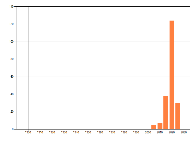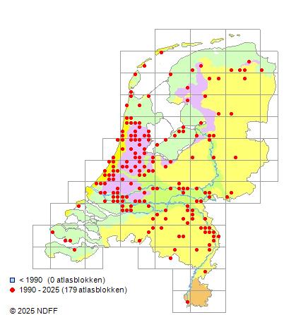 Het aantal atlasblokken (5x5 km) waarin de soort is gemeld binnen een periode van vijf jaar (vanaf 1980) of twintig jaar. Niet gecorrigeerd voor waarnemersinspanning en het aantal doorgegeven waarnemingen kan sterk variëren per periode, dus een trend in verspreiding kan hier niet direct uit worden afgelezen. Het opgegeven jaartal is het eerste jaar van de periode. Bron: gevalideerde waarnemingen uit de NDFF.