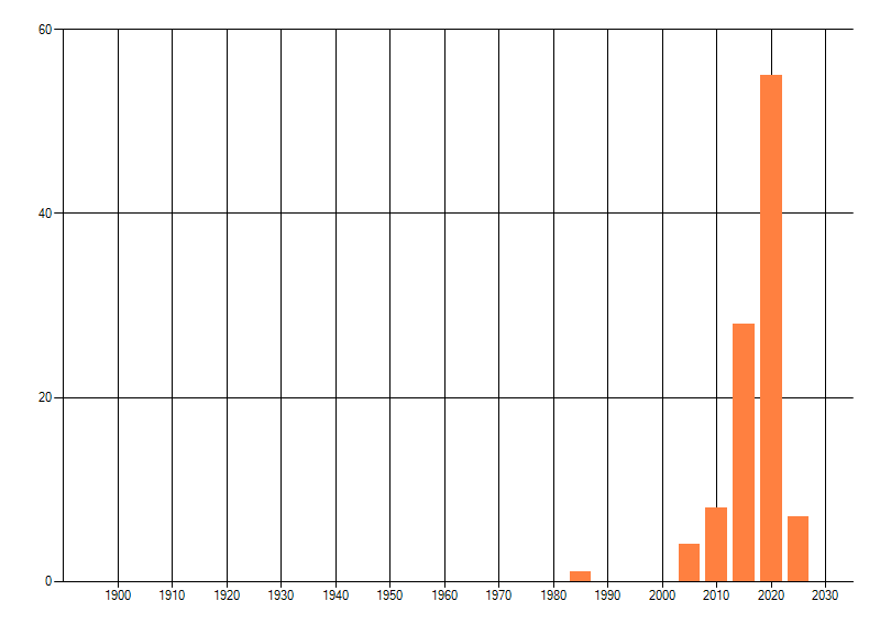 Het aantal atlasblokken (5x5 km) waarin de soort is gemeld binnen een periode van vijf jaar (vanaf 1980) of twintig jaar. Niet gecorrigeerd voor waarnemersinspanning en het aantal doorgegeven waarnemingen kan sterk variëren per periode, dus een trend in verspreiding kan hier niet direct uit worden afgelezen. Het opgegeven jaartal is het eerste jaar van de periode. Bron: gevalideerde waarnemingen uit de NDFF.