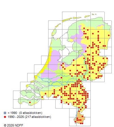 Het aantal atlasblokken (5x5 km) waarin de soort is gemeld binnen een periode van vijf jaar (vanaf 1980) of twintig jaar. Niet gecorrigeerd voor waarnemersinspanning en het aantal doorgegeven waarnemingen kan sterk variëren per periode, dus een trend in verspreiding kan hier niet direct uit worden afgelezen. Het opgegeven jaartal is het eerste jaar van de periode. Bron: gevalideerde waarnemingen uit de NDFF.