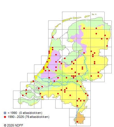 Het aantal atlasblokken (5x5 km) waarin de soort is gemeld binnen een periode van vijf jaar (vanaf 1980) of twintig jaar. Niet gecorrigeerd voor waarnemersinspanning en het aantal doorgegeven waarnemingen kan sterk variëren per periode, dus een trend in verspreiding kan hier niet direct uit worden afgelezen. Het opgegeven jaartal is het eerste jaar van de periode. Bron: gevalideerde waarnemingen uit de NDFF.