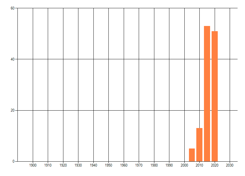 Het aantal atlasblokken (5x5 km) waarin de soort is gemeld binnen een periode van vijf jaar (vanaf 1980) of twintig jaar. Niet gecorrigeerd voor waarnemersinspanning en het aantal doorgegeven waarnemingen kan sterk variëren per periode, dus een trend in verspreiding kan hier niet direct uit worden afgelezen. Het opgegeven jaartal is het eerste jaar van de periode. Bron: gevalideerde waarnemingen uit de NDFF.