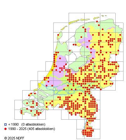 Het aantal atlasblokken (5x5 km) waarin de soort is gemeld binnen een periode van vijf jaar (vanaf 1980) of twintig jaar. Niet gecorrigeerd voor waarnemersinspanning en het aantal doorgegeven waarnemingen kan sterk variëren per periode, dus een trend in verspreiding kan hier niet direct uit worden afgelezen. Het opgegeven jaartal is het eerste jaar van de periode. Bron: gevalideerde waarnemingen uit de NDFF.