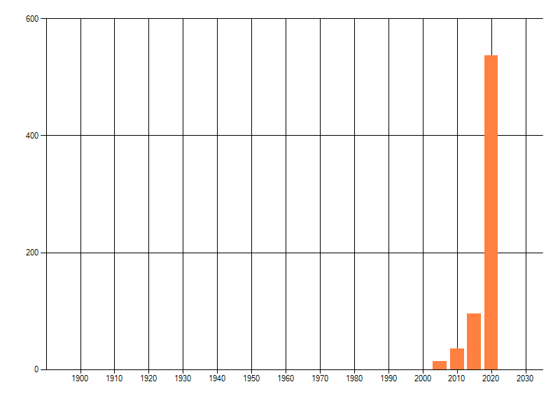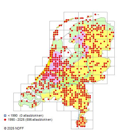 Het aantal atlasblokken (5x5 km) waarin de soort is gemeld binnen een periode van vijf jaar (vanaf 1980) of twintig jaar. Niet gecorrigeerd voor waarnemersinspanning en het aantal doorgegeven waarnemingen kan sterk variëren per periode, dus een trend in verspreiding kan hier niet direct uit worden afgelezen. Het opgegeven jaartal is het eerste jaar van de periode. Bron: gevalideerde waarnemingen uit de NDFF.